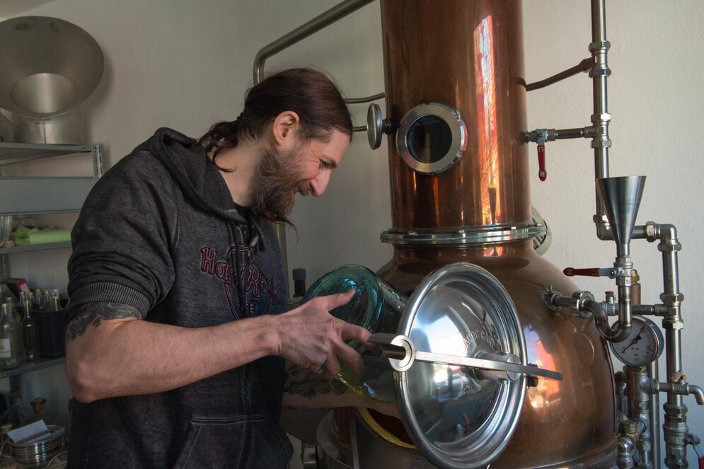 Auch für flüssige Souvenirs habe ich in Weißenstadt eine gute Adresse aufgetan. „Eher weniger und bewusst, als mehr und gedankenlos konsumieren“: So bringt Marcel Völkel seine Lebenseinstellung auf den Punkt. Das allein macht ihn mir schon sympathisch. In Sachen Musikgeschmack kommen wir zwar auf keinen gemeinsamen Nenner: Die Songs von „Dying Gorgeous Lies“ und „Wasteland Clan“, den beiden Metal-Bands des Gitarristen, klingen für mich zu sehr nach Endzeitstimmung. Aber Marcel Völkel hat ja noch ein anderes Talent: In sechster Generation führt er Sack’s Destille, einen 1864 gegründeten Traditionsbetrieb.