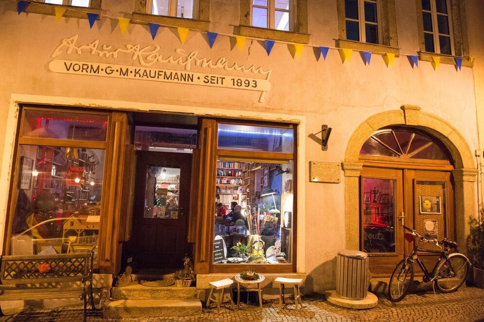 Mit Blick auf Rathaus, Kirche und Marktplatz, neben Pizzeria und Eisdiele, liegt das Antiquariat Kaufmann’s. Jedenfalls war es das mal, genauso wie es mal eine Fleischerei war und eine Sattlerei, ein verwinkelter Tante-Emma-Laden und ein Lagerraum für Stocknägel (das sind, ich musste auch erst aufgeklärt werden, anscheinend Souvenirabzeichen für Wanderstöcke – kennt das noch jemand?). Hoffentlich schreiben Olga, Philipp und Klaus (mit den jovialen Franken in Weißenstadt wechselt man beim ersten Bier zum Du) ja mal ein Buch, wie es dazu kam, dass sie als Trio Infernale den Laden übernommen haben, und warum der nach dem Fernsehdetektiv Wilsbergensis heißen musste. Jedenfalls haben sie kurzerhand eine Dorfkneipe für das 21. Jahrhundert ins Leben gerufen.