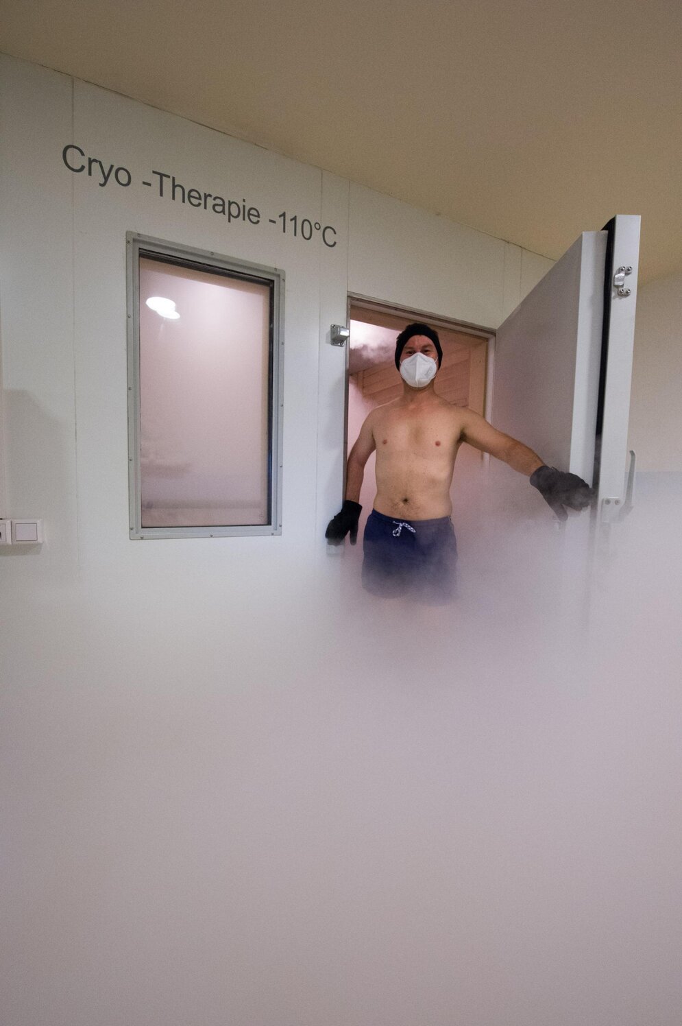 Ungewohnt? Ja. Unangenehm? Nein. Drei Minuten in der Kältekammer, bei minus 110 Grad: Das lässt sich nicht nur aushalten. Es ist sogar eine überraschend coole Erfahrung. Wesentliche Körperteile frieren dabei nämlich nicht ab, keine Sorge. Denn im Kurzentrum Weißenstadt am See marschiere ich nicht splitternackt in die Kabine. Neben Badehose trage ich Turnschuhe und Fäustlinge, Mund- und Ohrenschutz. Weil die Luft so trocken ist, ist das selbst für Frostbeulen wie mich erträglich. Die Kälte spüre ich vor allem am Oberkörper und in den Waden.