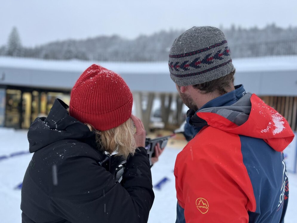 Zarte Schneeflocken schweben sanft aus dicken Wolken in Richtung Schießstand und Loipe. „Winterlandschaft vom Feinsten“, denke ich, während mir die ersten Flocken die Sicht nehmen und mir schon mal die perfekte Entschuldigung liefern, wenn ich gleich danebenschieße.