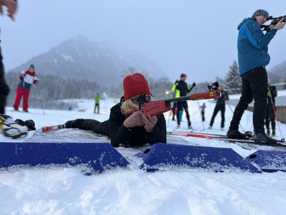 Schießen ist mir eher fremd, die Zeiten von Pfeil und Bogen sind schon lange vorbei und ein Gewehr hat zuletzt bei der Faschingsfeier im Kindergarten mein Outfit ergänzt - und das ist nun wirklich schon einige Jahrzehnte her. Und jetzt drückt mir Mathias Math also zum ersten Mal seit gefühlten Jahrhunderten ein Gewehr in die Hand. Schießen soll ich hier im neuen Nordic Zentrum von Obersdorf. Ich! Und nicht nur das - Langlaufen gehört auch zum Kurs. Schließlich habe ich einen Biathlon-Schnupperkurs gebucht. Quasi auf den Spuren von Denise Herrmann, der neuen Biathlon-Olympiasiegerin von Peking, wandeln. Ich bin gespannt.