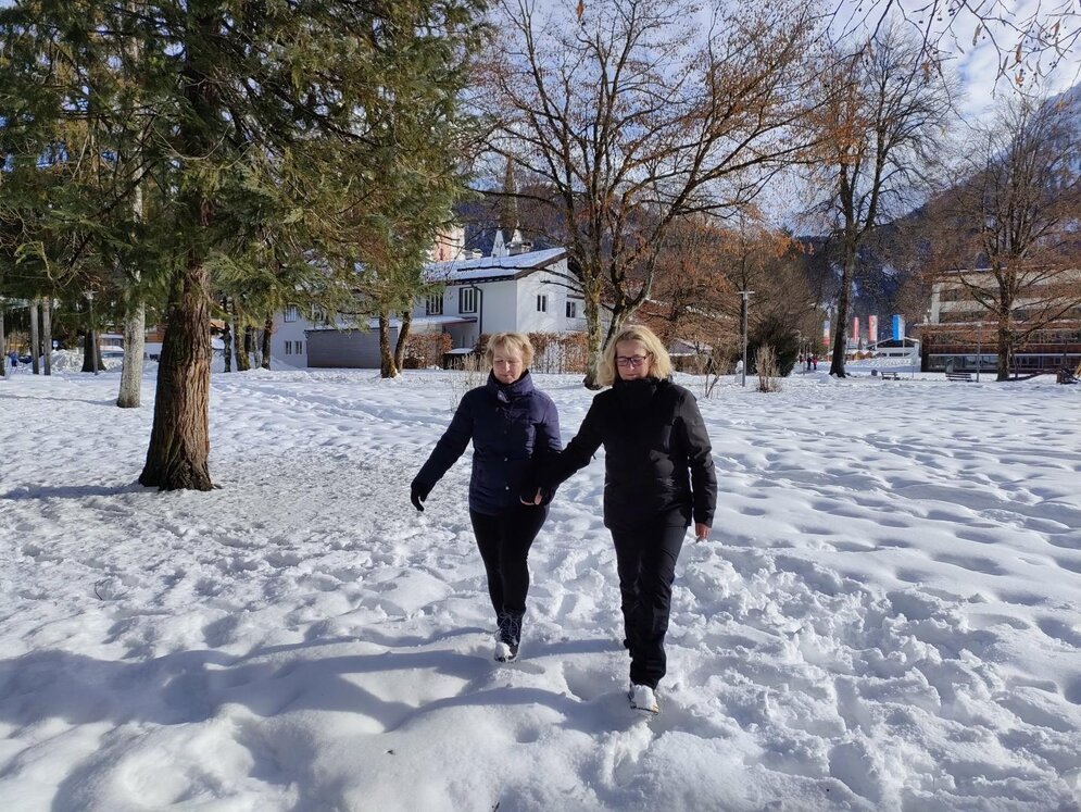 Kann ich das? Nach der nächsten Kurseinheit weiß ich, es geht. Ich muss es nur wagen. Persönlichkeitscoach Silvia Fink-Eisinger stapft durch den Schnee und erklärt die nächste Übung – es geht um Kommunikation, Selbstvertrauen, eine gesunde Portion Egoismus und die eigenen Bedürfnisse. Blind soll ich Hand in Hand mit einer weiteren Kursteilnehmerin einen dicken Baum umrunden. Was wohl die anderen Leute sagen? Doch der Gedanke verliert sich schon nach den ersten beiden Schritten. Es geht schließlich um den Baum und die Richtung. Wer führt, wer hört auf wen? Nicht das eigene Standing zählt, aber auch. Wer sich sicher fühlt, sollte es unbedingt sagen und dann ruhig die Führung übernehmen. Diese abzugeben, gehört ebenfalls zum Lernprozess. Das Miteinander zählt.