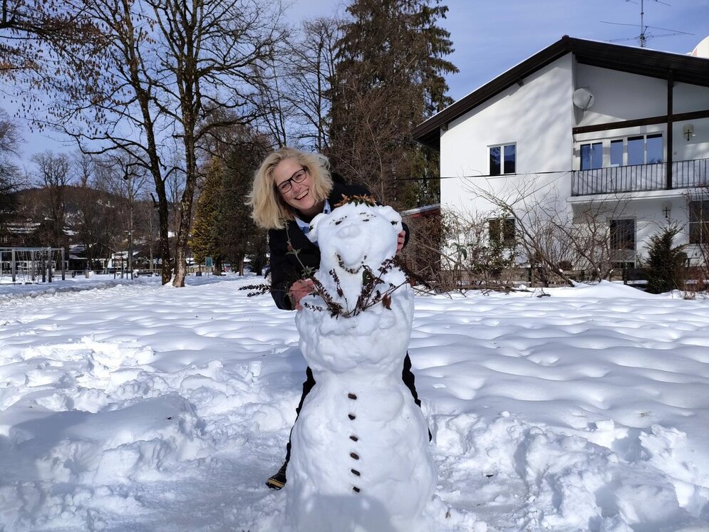 Und wann habe ich zum letzten Mal einen Schneemann gebaut? Ok, es wird eine Schneefrau, eine wunderschöne. Ich vergesse, wie schon beim Biathlon, beim Fokussieren auf die Zielscheibe, auf den Schuss, die Welt um mich herum. Kind sein, einfach machen, einfach Spaß haben, spielen, experimentieren, verwerfen. Dabei sei die Hingabe an das Hier und Jetzt ganz besonders wichtig, das innere Kind sollen wir dabei wecken, erklärt mir Silvia das Scheemannbauen für Erwachsene. Und es klappt. Die passenden „Ohrringe“ für die Schneefrau zu suchen, ist auf einmal viel wichtiger als alle Gedanken, als alle Pläne, als alles „Müssen“.