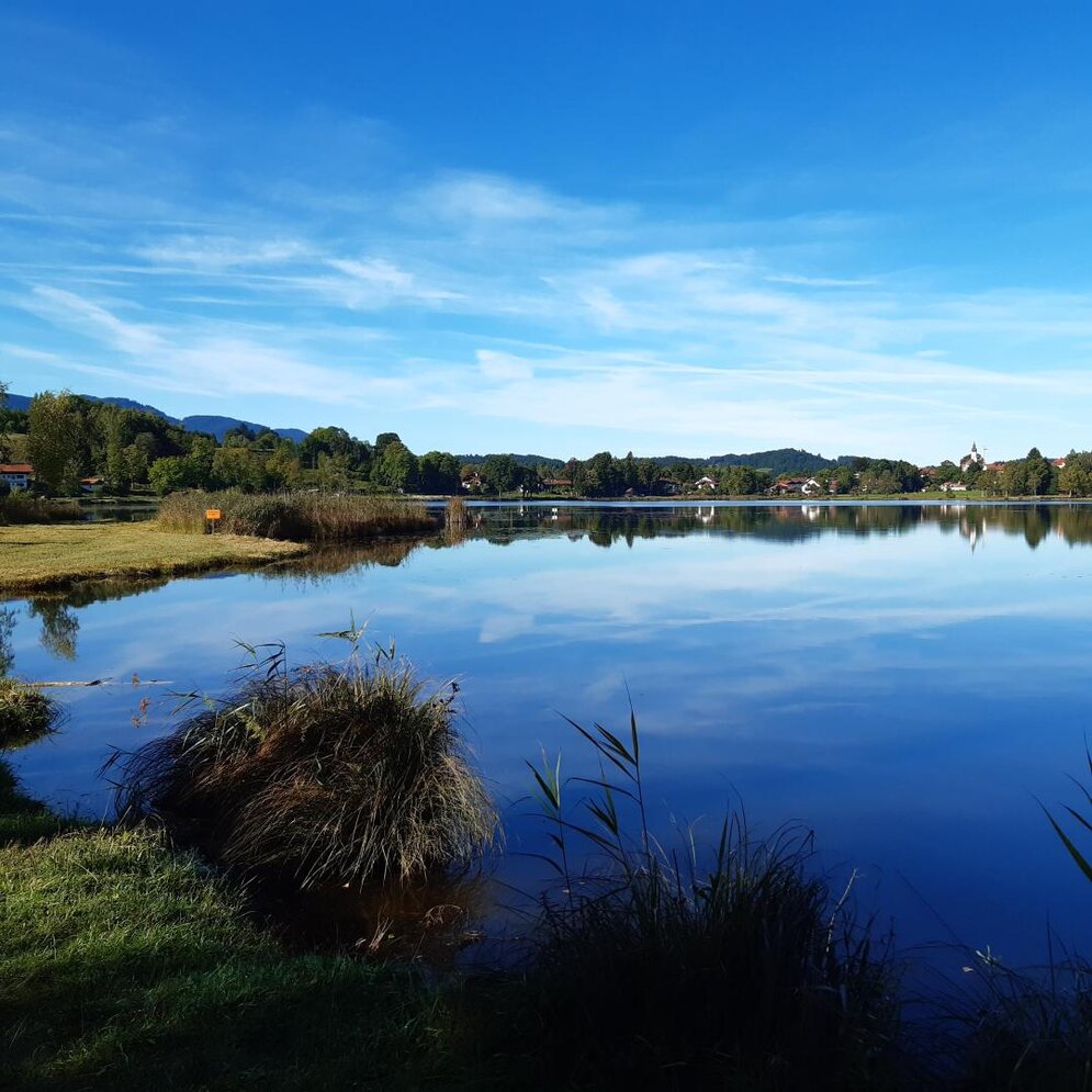 Bad Bayersoien ist das jüngste bayerische Bad. Es trägt seinen Titel erst seit 1996. Der See des kleinen Kurortes ist dafür umso älter. Er stammt noch aus der letzten Eiszeit, als sich die Gletscher langsam zurückgezogen und das Land darunter freigegeben haben. Und wie er so am Morgen daliegt, wirkt er doch ziemlich frisch. Angeblich ist er gar nicht so kalt, wie er aussieht. Das jetzt auszuprobieren, ist nun wirklich nicht mein Ding. Da lasse ich lieber die anderen schwimmen. Und tatsächlich, am Südufer steigt eine badehaubenbestückte Dame ganz vorsichtig ins Wasser, pustet kurz und schwimmt davon. Später treffe ich bei meiner Wanderung um den See auf noch mehr mutige Frühbader. Sie versuchen, das ganze Jahr an ihrem Morgenbad festzuhalten. Ich kann es verstehen, zumindest von der Optik her. Er lockt, wie es so daliegt und den Wolken ihr Spiegelbild zeigt. Doch er ist kalt – meine Vernunft sagt nein und sie gewinnt.
