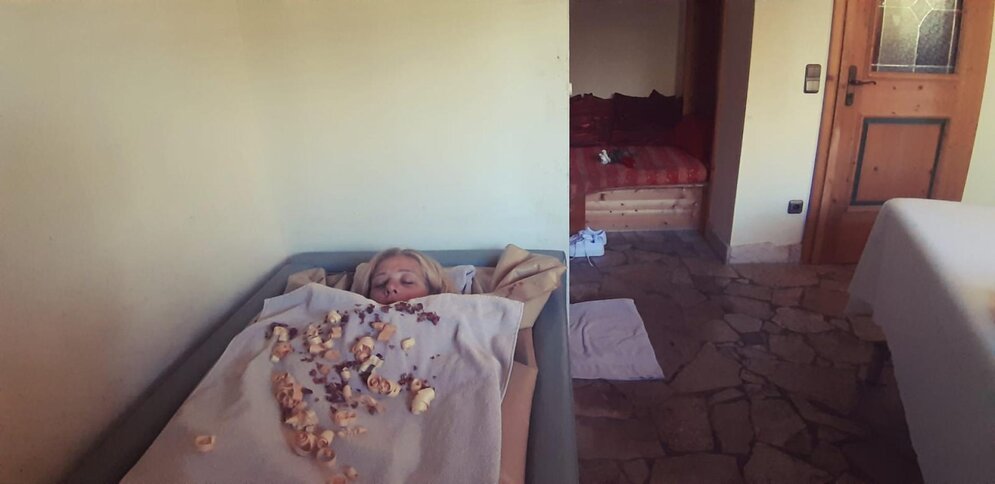 Und so bekomme ich am Morgen gleich die doppelte Portion Lebensgewürz. Denn mein erstes richtiges Moorbad ist gerichtet. Vor dem Einstieg steckt mir meine Badefrau noch eine Portion Galgant zu: „Für die bessere Durchblutung und das Herz,“ erklärt sie noch, während sie mir beim Einstieg ins dichte, dicke, dunkle Moor hilft. Zwischen 39 und 41 Grad soll es warm sein. Individuell abgestimmt auf jeden Badegast. Meines hat heute runde 40 Grad. So soll eine Art künstliches Fieber erzeugt und die Durchblutung jedes einzelnen Organs aktiviert werden. Das hilft bei Depressionen, Burnout und bei Erschöpfung. Es nimmt den Stress und beruhigt. Die Lebenskraft wird angekurbelt und dazu auch noch gesteigert.