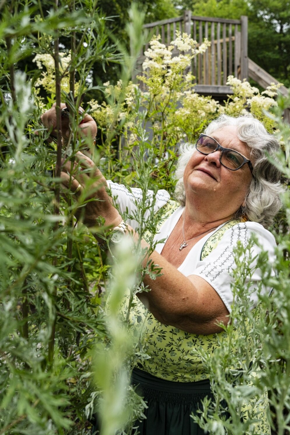 Anneliese ist eine „Kräuterhexe“ mit Leib und Seele, zu jeder Pflanze gibt es viel zu erzählen. Wir laufen an einem Beet mit mehr als zehn Sorten Minze in allen möglichen Grüntönen vorbei, an den „Kurschatten-Gewächsen“, denen aphrodisierende Wirkung nachgesagt wird, zum Wermut, der uns alle überragt. „Keimtötend und gut für Magen, Leber und Galle“, erklärt Anneliese, während sie schon das nächste Kraut zart berührt: „Die Schafgarbe ist auch beim Entgiften ein Mutitalent. Man kann sie sehr gut für Quarks und Aufstriche verarbeiten. Früher legte man den Kindern drei Blätter davon aufs Auge, das gibt süße Träume.“