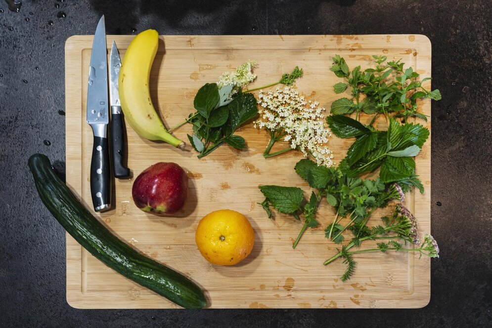 Uschi sieht meinen Blick und muss lachen: „Mach dir keine Sorgen, ich hasse es, wenn ,gesund’ nicht schmeckt. Ich bin selber Feinschmeckerin.“ Während ich vorsichtig die Gurke für den Smoothie schneide (derart super-scharfe Messer bin ich gar nicht gewohnt…), presst sie ratz-fatz eine Zitrone aus, schnibbelt Apfel und Bio-Orange und und erklärt dabei: „Verwendet Bio-Obst möglichst immer mit Schale! Da sind viele Pektine drin, wasserlösliche Ballaststoffe, die unsere Darmflora füttern.“