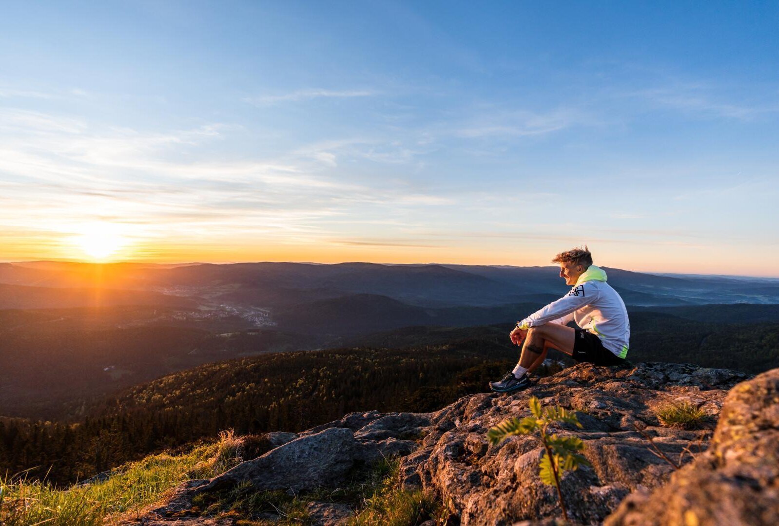 Ich staune still, denn ein grandioses Naturspektakel verschlägt mir die Sprache. Nebelschwaden wabern durchs bereits dunkle Zellertal, das eingerahmt ist von herbstlich-buntem Laubwald und dem Immergrün der Fichten und Tannen. Am Horizont verabschiedet sich ein goldgelb leuchtender Feuerball, rostrot glüht der Abendhimmel. Doch ich staune – so viel Ehrlichkeit muss hier sein – nicht nur deswegen still, weil sich um mich herum ein Panorama ausbreitet, das aussieht wie das Meisterstück eines bayerischen Landschaftsmalers. Sondern eben auch, weil Atemluft knapp und kostbar ist, wenn man gerade viel zu schnell einen steilen Hang hinaufgestiefelt ist, um ja nicht den Sonnenuntergang zu verpassen.
