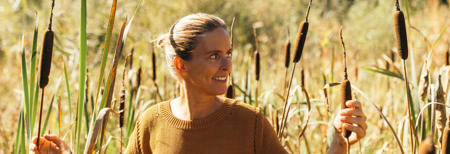 Hier sehen Sie die Bayern Botschafterin und Waldbademeisterin Elke Seidel. Sie riecht an einer Pflanze.
