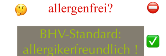 Der BHV-Standard für Allergikerfreundlichkeit schafft hier Abhilfe. In den BHV-Schulungsveranstaltungen werden die Betriebe mit dem neuen Standard vertraut gemacht und lernen, sich nach den für jede Betriebsart festgelegten, standardisierten Bedingungen auszurichten. Dies gibt den Betrieben Sicherheit, auch im Umgang mit Gästen, die bestimmte Allergene meiden müssen.
