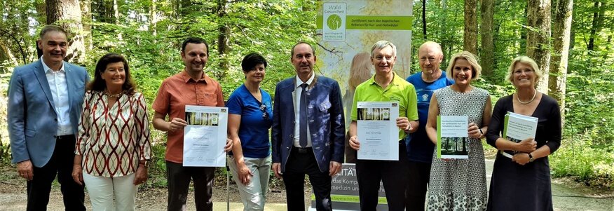 Der Bayerische Heilbäder-Verband (BHV) und die Ludwig-Maximilians-Universität München (LMU) schlossen ihr Pilotprojekt „Wald und Gesundheit“ am Montag (18.Juli) in Bad Wörishofen mit der Übergabe der Zertifikate durch Wirtschaftsminister Hubert Aiwanger ab. Das Projekt ist bundesweit einmalig. Denn die Ludwig-Maximilians-Universität erarbeitete in dreijähriger Arbeit unter Beteiligung des BHV und von 15 Pilotorten ein Handbuch für die Zertifizierung. Nach den darin festgelegten Kriterien können künftig auch Waldbesitzer, Gesundheitsbetriebe oder Nicht-Kurorte Wälder zertifizieren lassen. Das Bayerische Staatsministerium für Wirtschaft, Landesentwicklung und Energie förderte das Projekt mit 347.605 Euro.