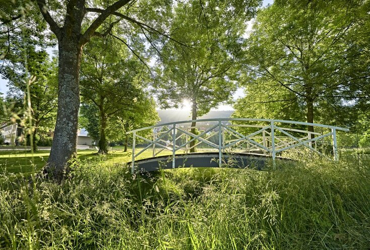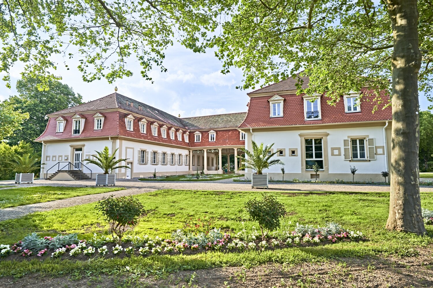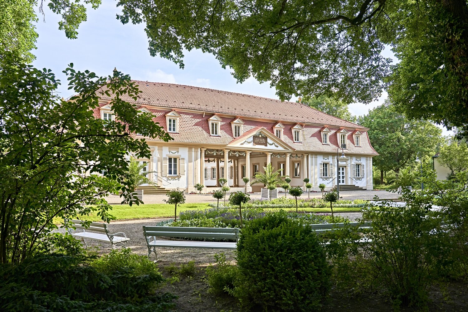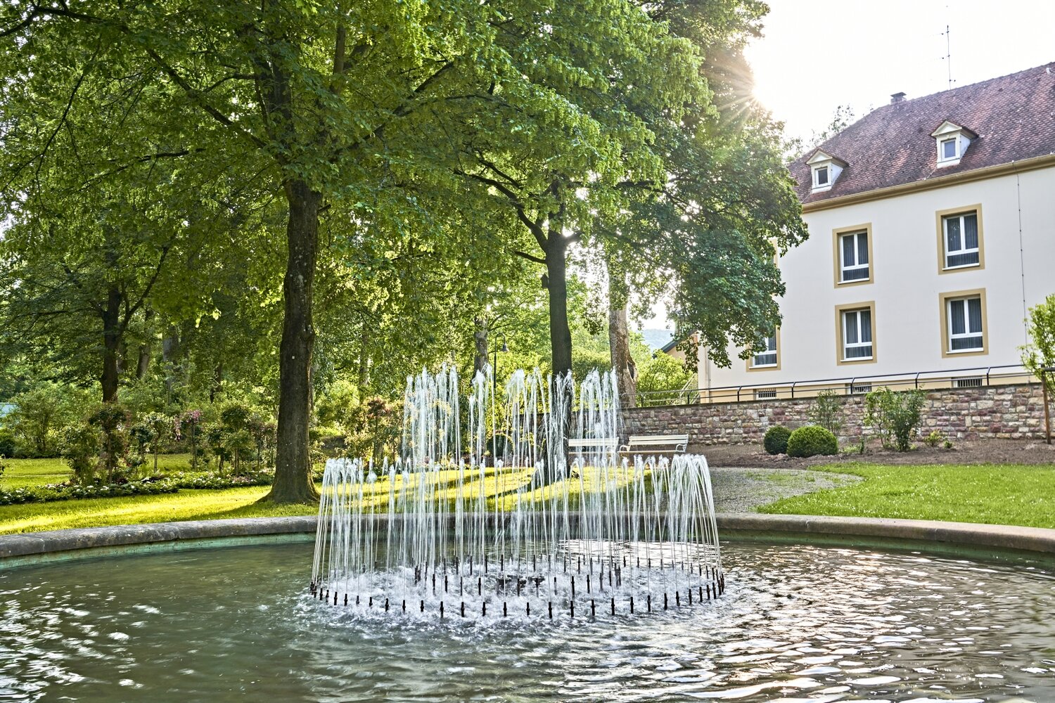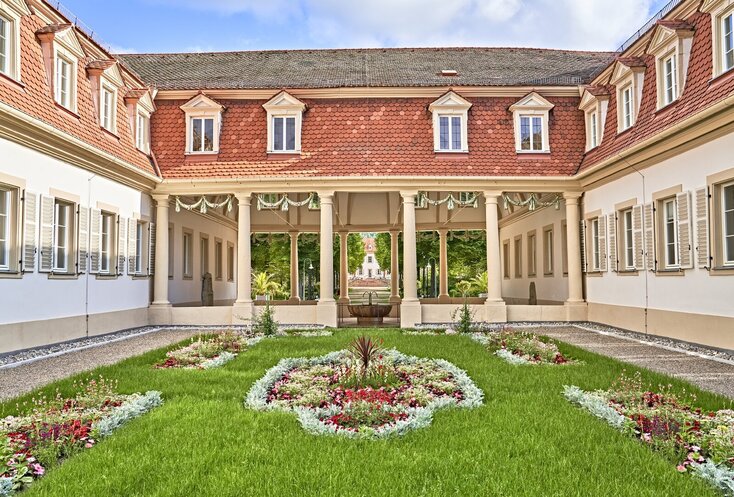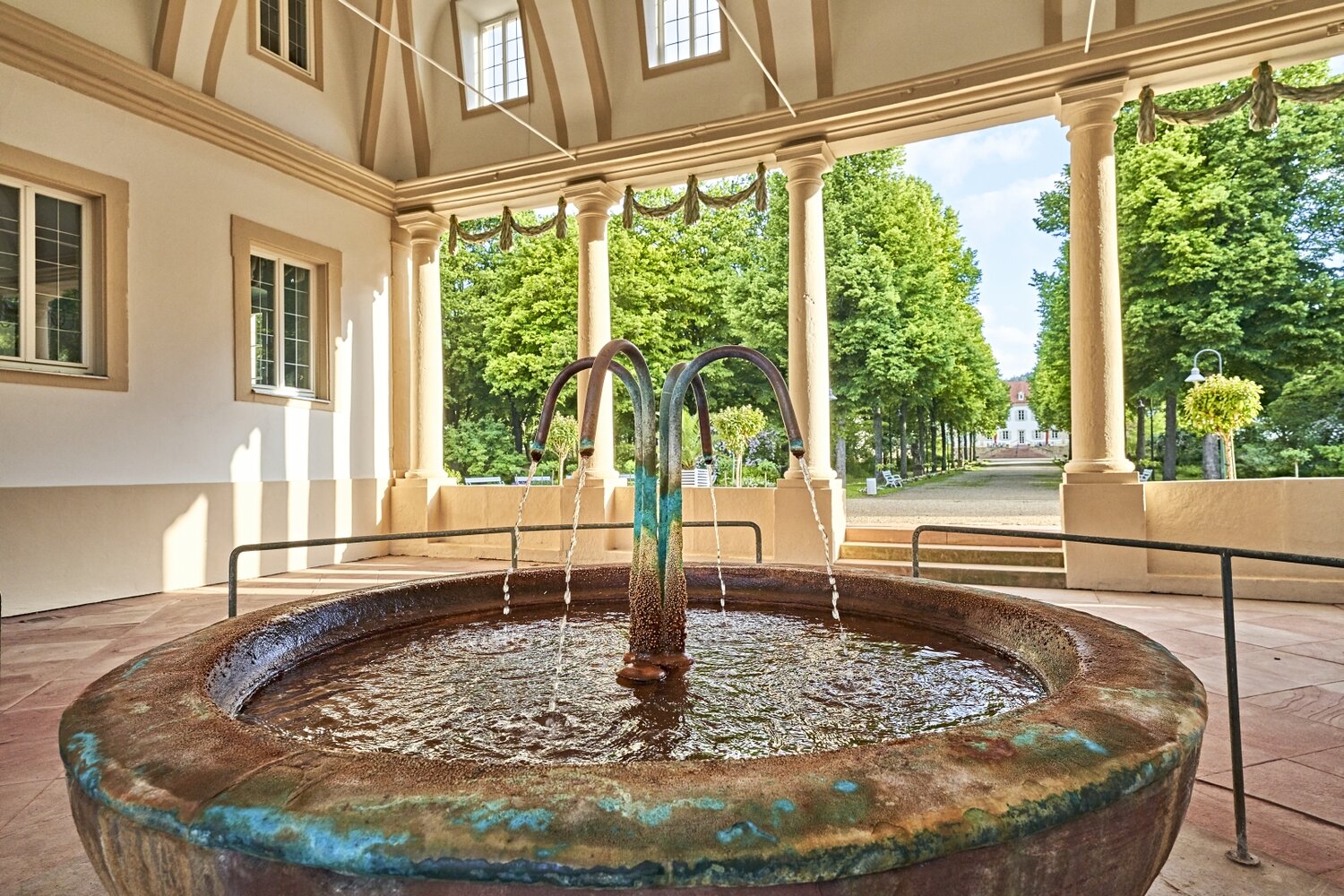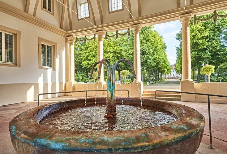 Wie zur Entstehungszeit zwischen 1785 und 1793 sprudelt hier auch heute noch die Balthasar-Neumann-Quelle. Wer ihr Wasser mit dem hohen Gehalt an Eisen, Hydrogencarbonat, Magnesium, Kalzium und Kalium regelmäßig trinkt, regt unter anderem den Stoffwechsel an, entgiftet den Körper, stärkt das Immunsystem, vitalisiert den gesamten Organismus und aktiviert die Selbstheilungskräfte. Im Saalbau nebenan: ein ganz besonderer Lesesaal. Wer dort zwischen Biedermeier-Möbeln und hellblauen Wänden in den angebotenen Zeitungen und Magazinen blättert oder an einem der Schreibtischen eine Karte nach Hause schreibt, tritt beinahe eine Zeitreise in die Vergangenheit an. Die drei Flügel öffnet der Brunnenbau Richtung Kurpark – eine großzügige, ruhige Anlage, in der man der Welt zwischen Springbrunnen, weißen Holzbrückchen, uralten Bäumen und weiten Wiesen wunderbar eine Zeit lang verlorengehen kann.