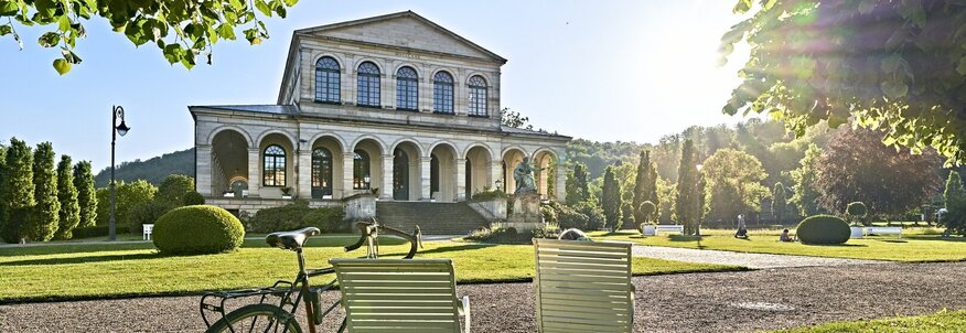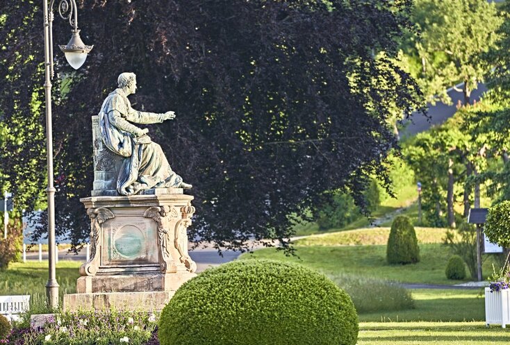 Das von Ludwig I. geschaffene Setting rund um den Fürstenbau, in dem er seinen Regierungsgeschäften nachging, war aber auch wirklich verführerisch! Schon 1819 entstand das Bellevue als klassizistisches Gästehaus im toskanischen Stil nach Plänen des Baubeamten Bernhard Morell. Von 1823 an ersetzte der neue Badbau das alte Badehaus von 1779: Entworfen vom königlichen Privatarchitekten Leo von Klenze, der in München unter anderem den Königsplatz, die Alte Pinakothek und die Residenz gestaltete, entstand eine Art dreigeschossiges Palais mit Giebel in der Mitte. Das klassizistische Kursaalgebäude von 1833 entwarf der Hofbauconducteur Johann Gottfried Gutensohn, seitdem lässt es sich unter unzähligen Arkaden flanieren und im Inneren Deckenmalereien im Stil der italienischen Renaissance bewundern. Direkt davor: ein Standbild des bayerischen Königs, der den Ort so prägte.