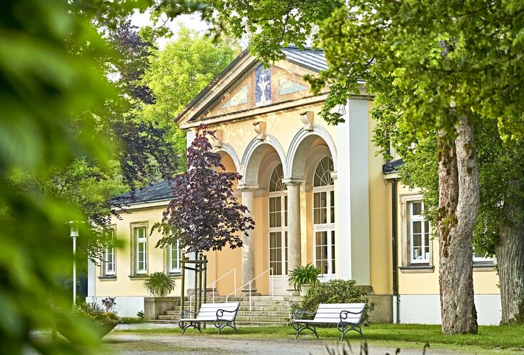 Als eines der ersten bayerischen Heilbäder setzte das unterfränkische Bad Bocklet bereits Mitte des 18. Jahrhundert prachtvolle Maßstäbe: Unter den Würzburger Fürstbischöfen wurde bis 1766 im romantischen Tal der Fränkischen Saale der Fürstenbau gebaut. Seine herrschaftlichen Walmdächer, pastellblauen Fensterläden und weiß-gelben Fassaden zogen Domherren, Prälate und Beamte des Hofes an, zunächst nur zur Sommerfrische. Erst als 1787gegenüber der frühklassizistische, tempelähnliche Brunnenbau entstand, entworfen vom Hofarchitekten Johann Philipp Geigel, änderte sich das Renommee des Orts: Bad Bocklet wurde zum Hofbad.
