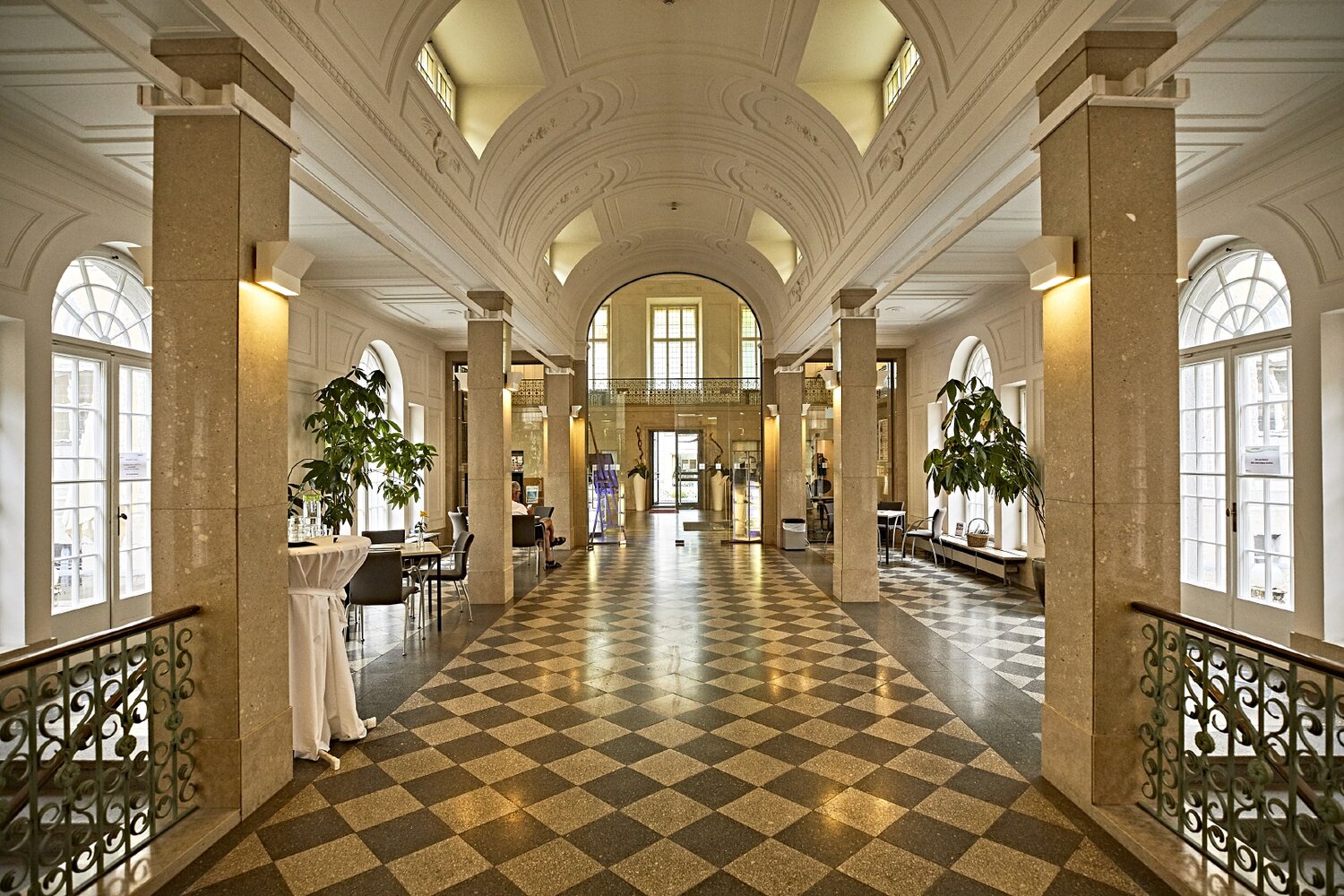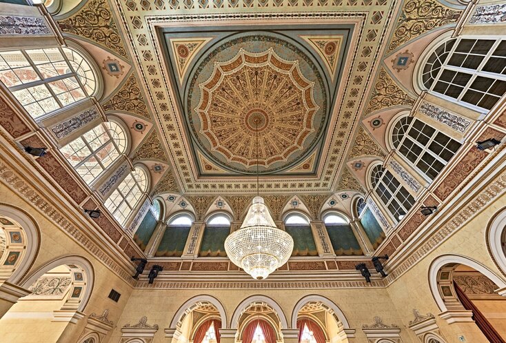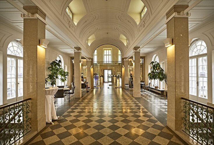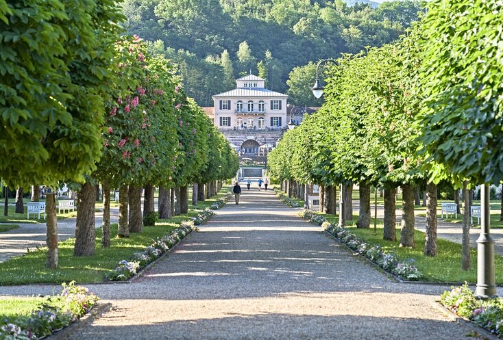 Ein weiteres Mal sorgte König Ludwig I. für herrschaftliches Flair, denn auch ins unterfränkische Bad Kissingen, das seit Sommer 2021 zum UNESCO-Welterbe zählt, schickte der royale Baukunst-Fan einen seiner besten Männer: Baurat Friedrich von Gärtner, der in München unter anderem das Uni-Gebäude und die Feldherrnhalle konzipierte. 1838 war Gärtners dreiflügeliger Arkadenbau aus gelbem Sandstein fertig. Stolze 46 Rundbögen öffnen sich seitdem auf einer Breite von etwa 200 Metern zum Kurgarten hin. Im Inneren mit byzantinischen Wandbildern und farbiger Kassettendecke: der prächtig ausgestattete Rossini-Saal, in dem Konzerte, Vorträge, Tagungen und Feste stattfinden.