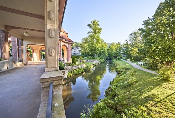 Eines der Gebäude ist der Brunnenbau. Er öffnet seine Flügel Richtung Süden hin zur Eschenallee, der Verlängerung der Linden aus dem Kurgarten. Herrschaftlich führt dieser zweireihige Baumweg in die ruhige Landschaft des Kurparks. Auf etwa 14 Hektar kann man sich zwischen Fränkischer Saale, naturbelassenen Wegen und uralten Bäumen ganz den Geräuschen der Natur hingeben – der Würze weiter Wiesen, dem Rauschen des Laubs, dem Zwitschern der Vögel, dem Plätschern des Wassers.