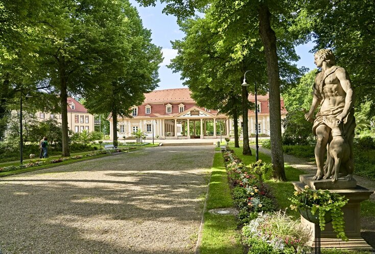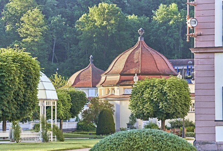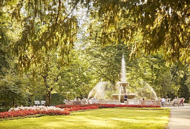 Wem nach etwas mehr Bewegung ist, wird im nördlichen Teil des Kurparks glücklich: Ein Wanderpfad führt rund 2,5 Kilometern übers Grün, durch Wälder, vorbei an Teichen, Sitzgruppen, einem Gartenrondell, Liegestühlen, knorrigen Buchen und uralten Rotfichten. Die passende Klangkulisse dazu liefert beständiges Vogelgezwitscher – und nach dem Spaziergang womöglich ein Konzert des Kurensembles im Musikpavillon oder Wintergarten des Kurhauscafés. Das ganze Parkensemble steht übrigens seit 2010 unter Denkmalschutz. Das macht die Gartenarchitektur so ursprünglich: Die Alleebepflanzungen und Sichtachsen sind immer noch so erhalten, wie sie die Gartenarchitekten Arthur und Wolfgang Singer entworfen haben.